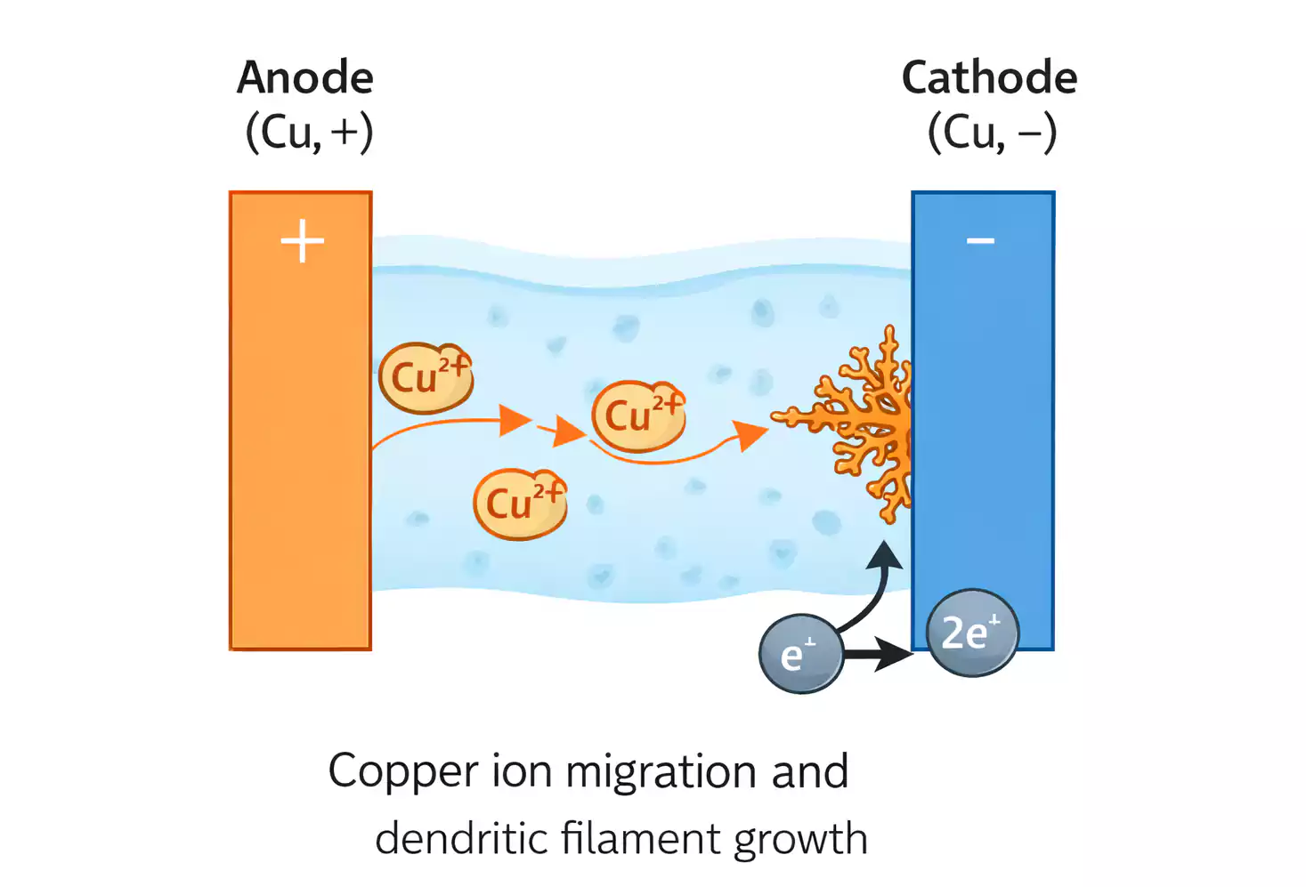 Higher DC voltage accelerates the dissolution and migration of copper ions. - A susceptible material pathway