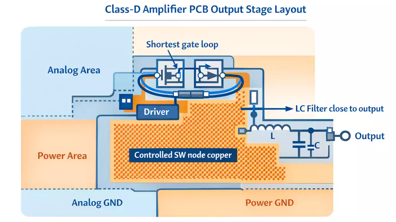 Class-D amplifiers switch at hundreds of kilohertz, so layout is critical.