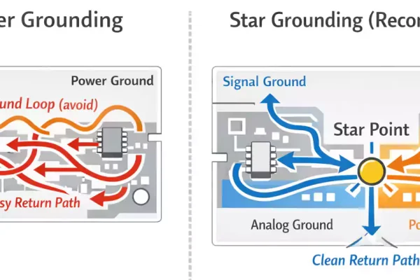 Each via adds inductance. Keep high-frequency or feedback signals on one layer when possible. When crossing layers, ensure the reference ground plane remains continuous under the trace. Never route sensitive lines across gaps in the ground plane.