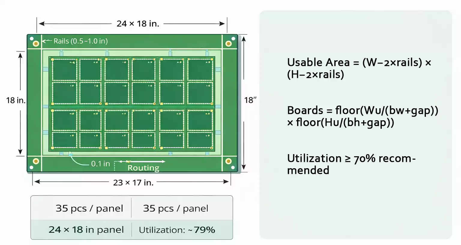 However, not all of that area is usable. Each panel includes rails (also called panel borders or process edges) that help with transportation and tooling. To calculate usable space: